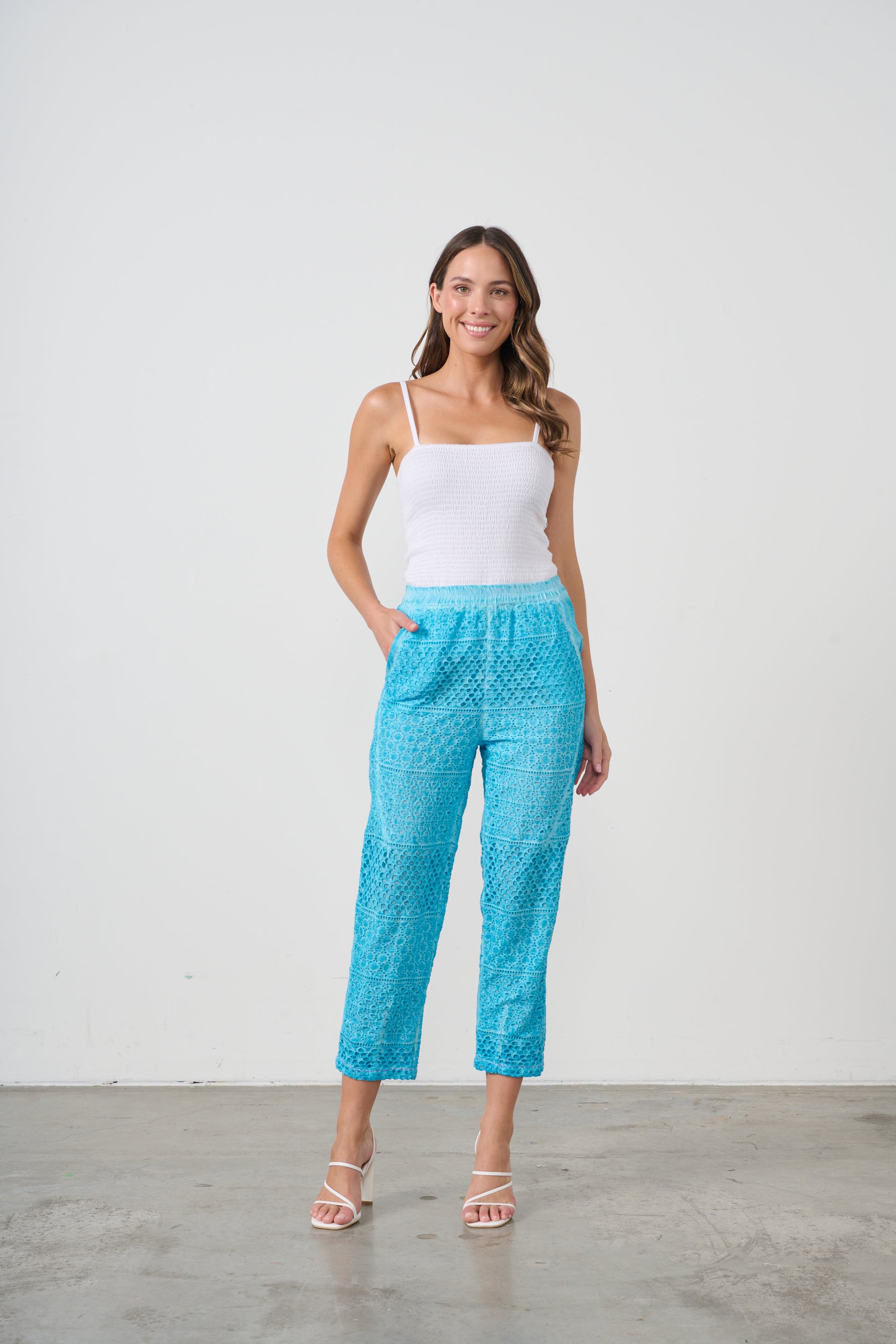 Brighten your wardrobe this Spring with these new Broderie Pants from CAJU. Made from 100% Cotton they will be perfect for coffee dates or Summer BBQ nights. Also available in Pink.