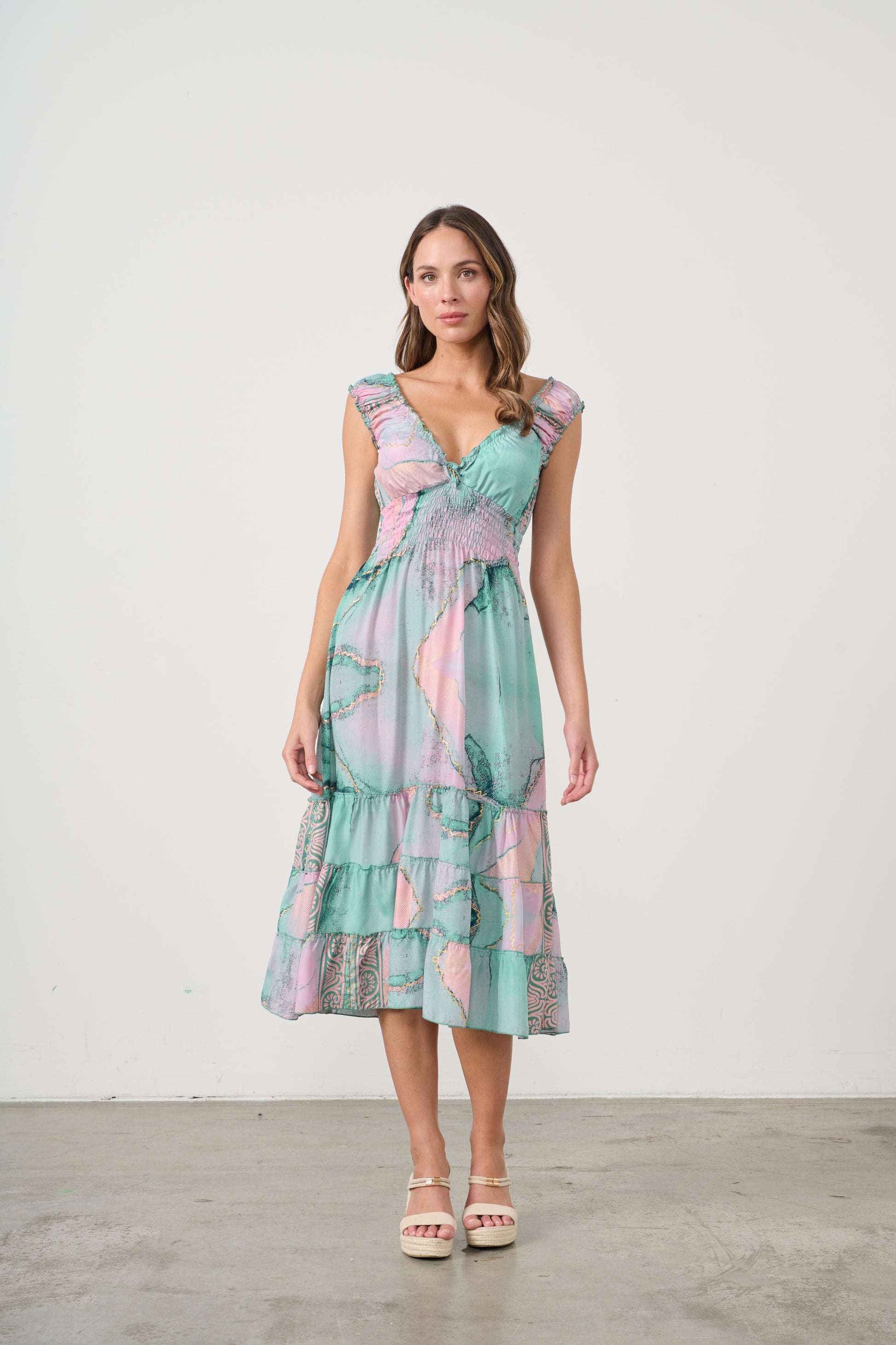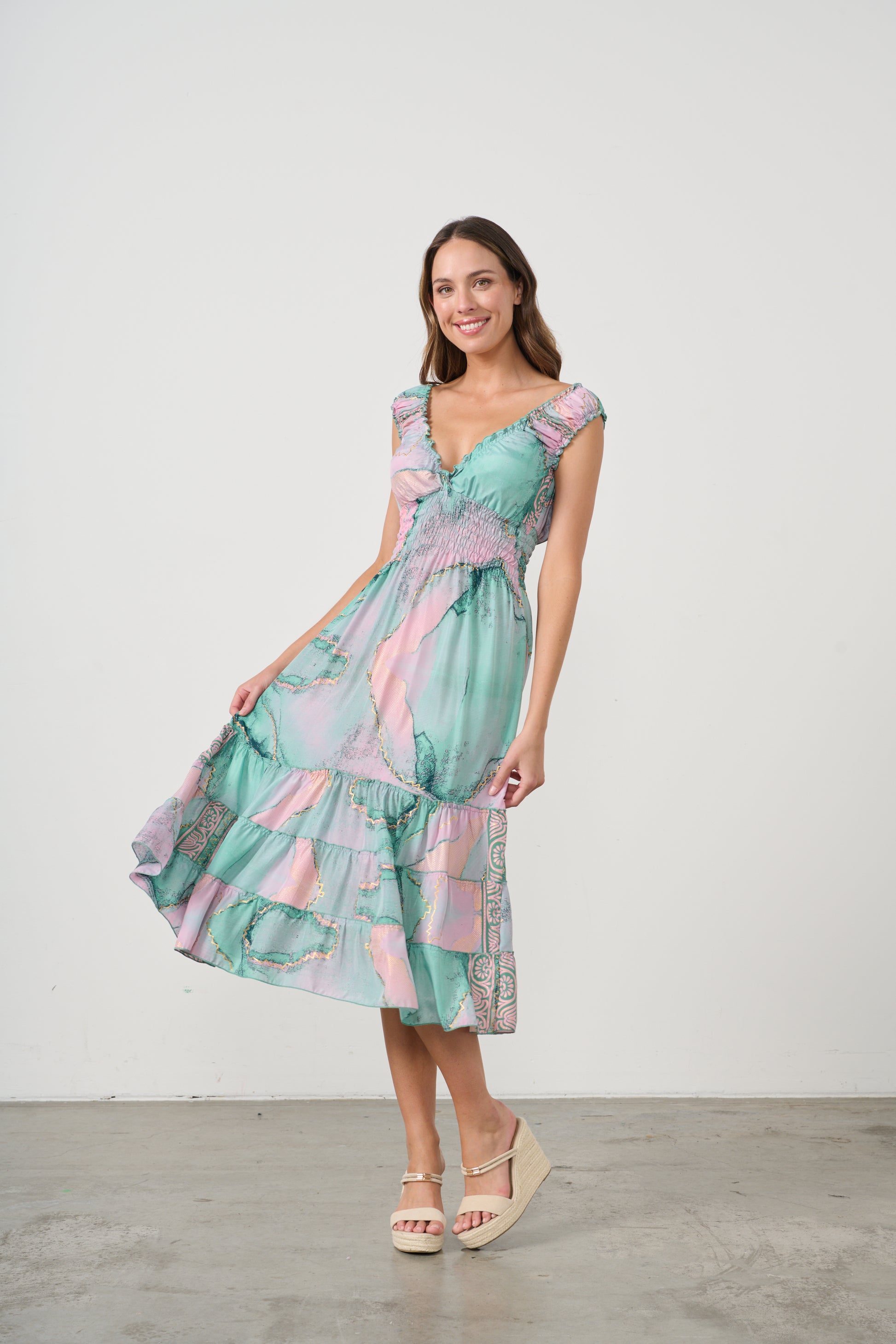 CAJU MARBLE PRINT DRESS WITH SHIRRED WAIST IN PINK