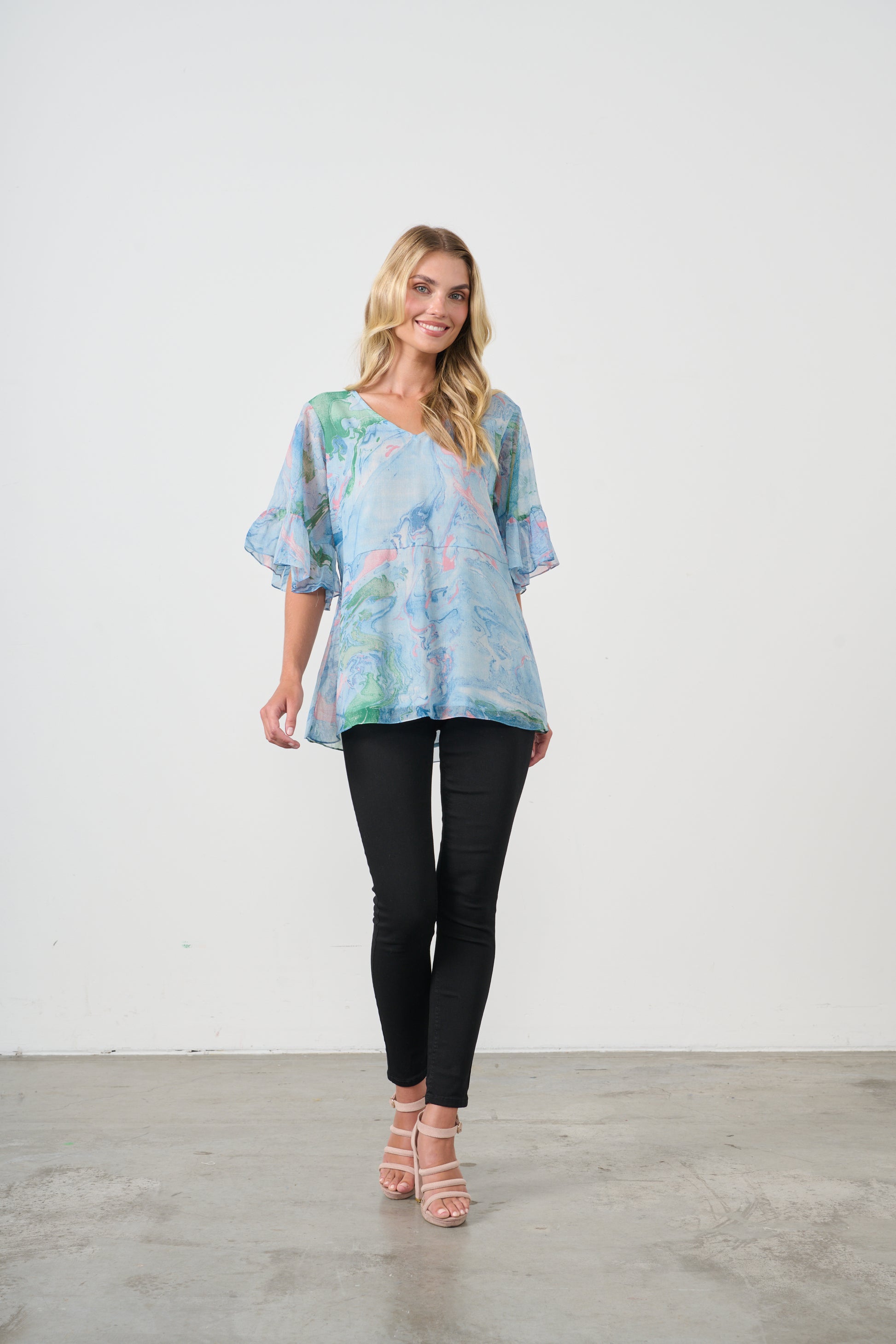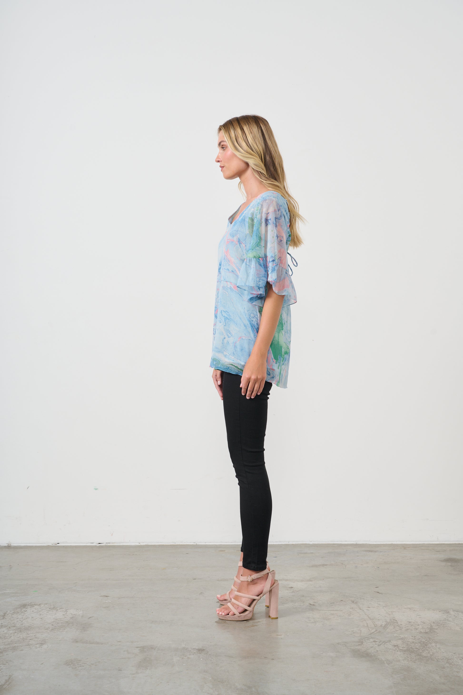 This beautiful blouse from Holmes & Fallon features feminine floaty sleeve and a laced back detail. Sheer outer fabric in a delicate marble print.