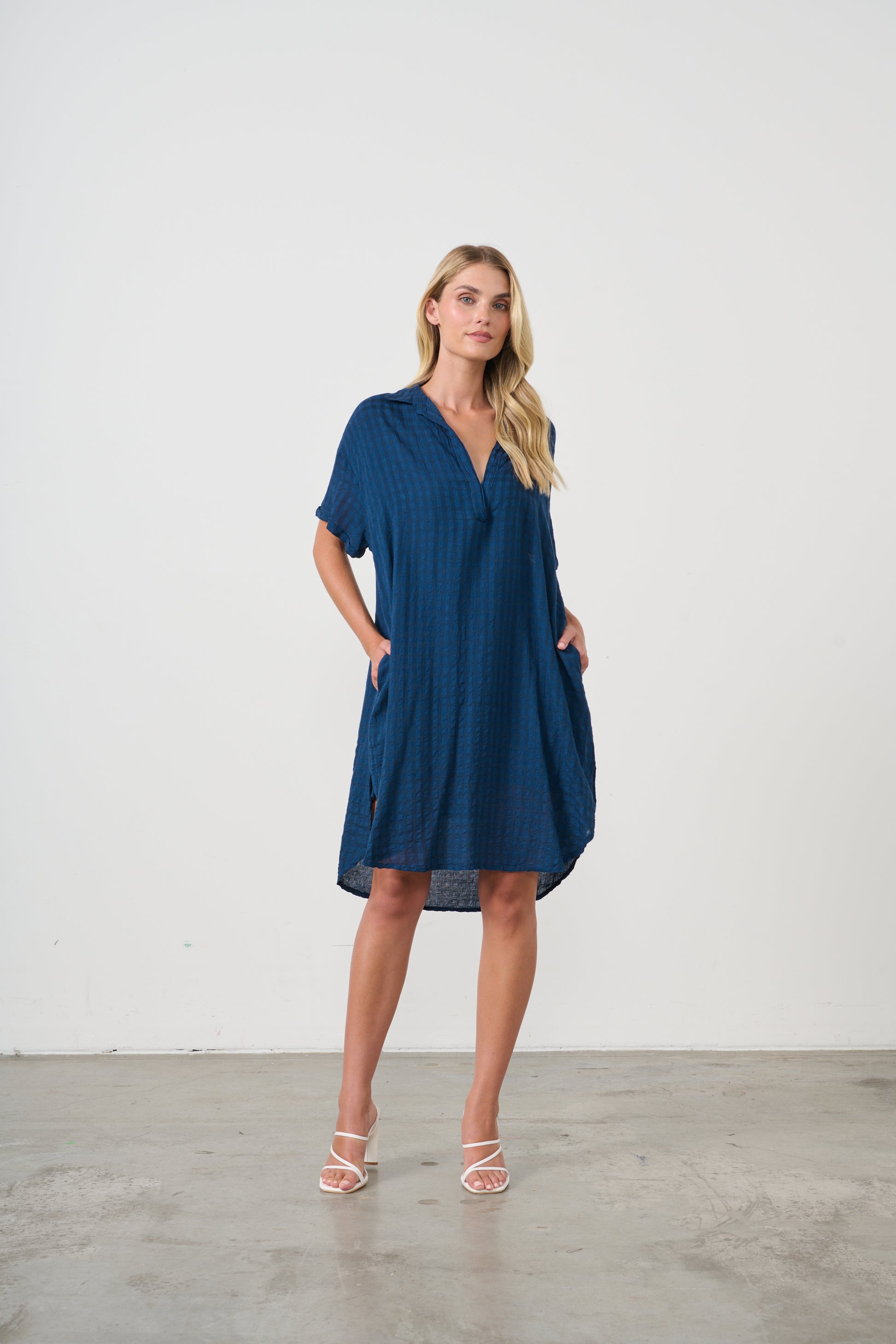 HOLMES & FALLON SEERSUCKER DRESS WITH SCOOP HEM & POCKETS