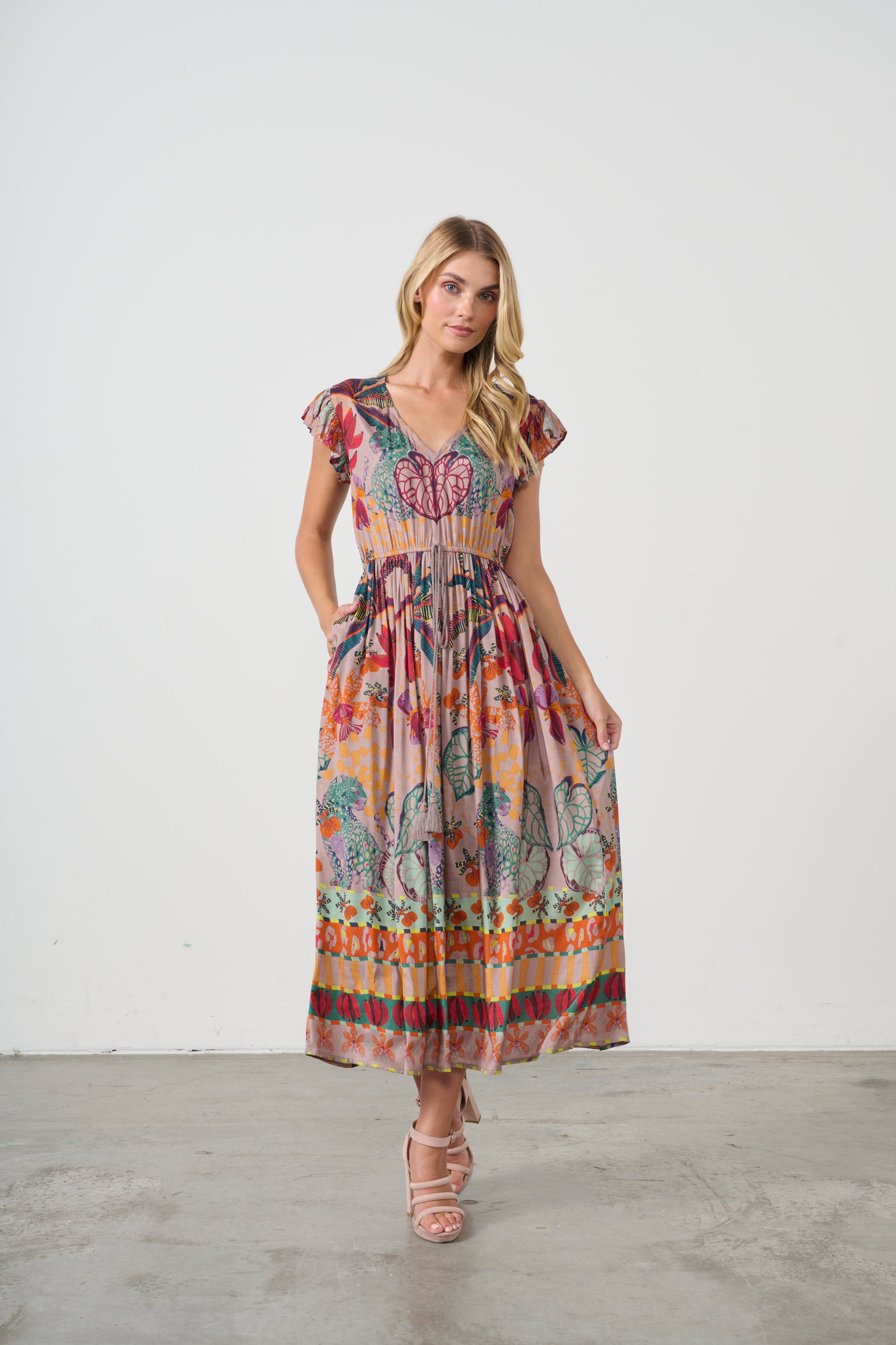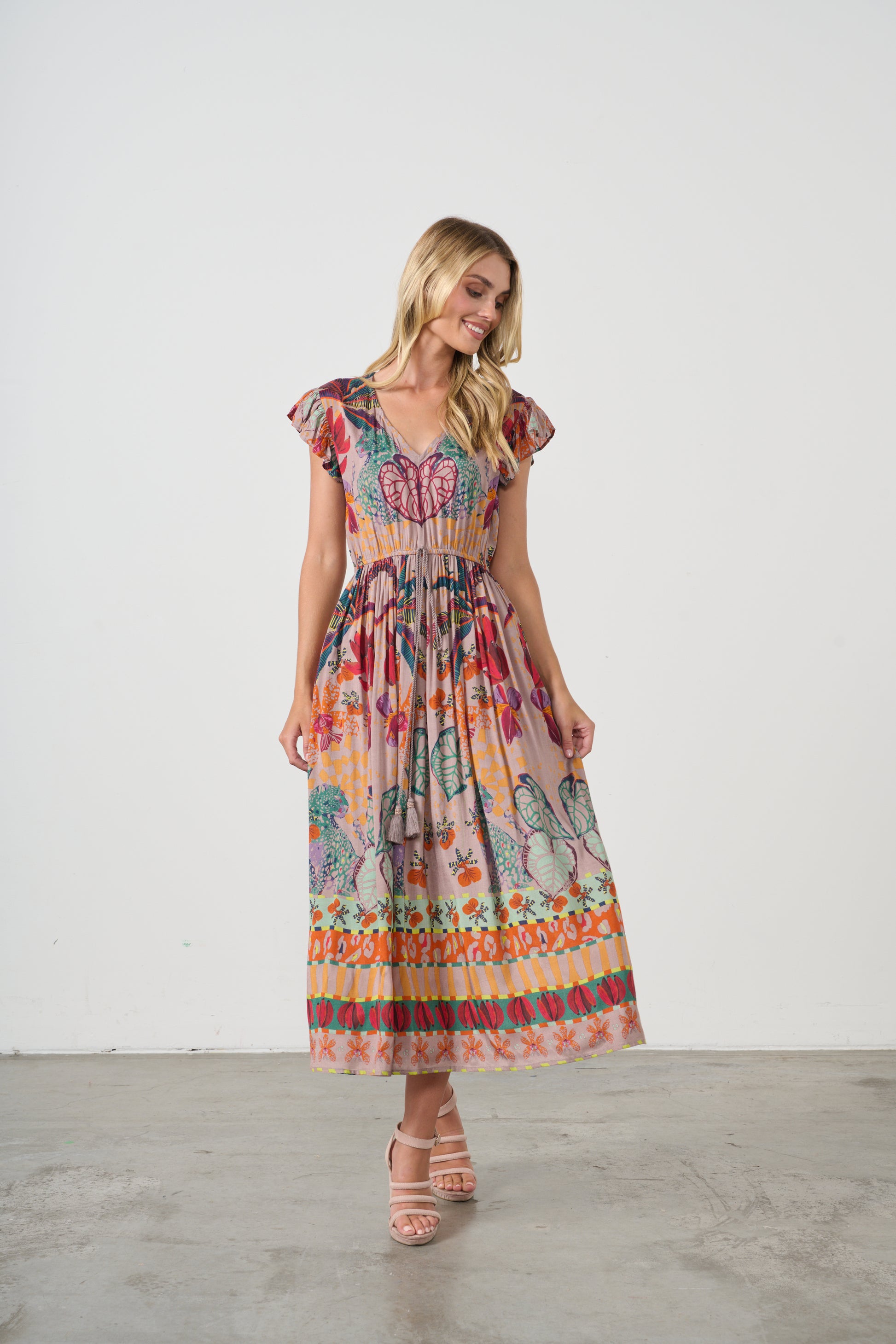 HOLMES & FALLON TROPICAL PRINT ELASTIC WAIST DRESS IN MUSHROOM